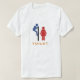 Este t-shirt é chamado do "o humor toalete" as mostras brancas do t-shirt um homem que espreita sobre as paredes de um toalete que olha uma mulher. As figuras estão em azul e no vermelho com o "toalete" escrito abaixo das imagens. este design engraçado é perfeito como um presente ou como um original e funky para o senhor mesmo
