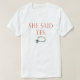Camisetas e presentes de noivado perfeitos para a sua despedida de solteiro, festa de noivado ou fim de semana. Roupa e presentes de noivos com fotografia de um anel de diamante e texto que permitem que todos saibam que ela disse sim quando você fez a pergunta. Camisas de noivado, presentes e favores.