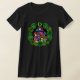 Um t-shirt com os cogumelos psicadélicos coloridos cercados por paisley verde e por mandalas verdes.