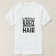 Se você ama uma boa risada, esta é a camisa perfeita para você. Ela apresenta a frase "Com um corpo como este que precisa de cabelo" em letras negras em uma camisa branca. Esta camisa engraçada de ginástica é excelente para um exercício, um dia na praia, ou uma noite na cidade.