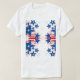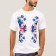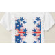Uma t-shirt branca com um design vibrante de estrelas e listras vermelhas, brancas e azuis.