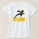 Tirando T-shirts, canecas, bolsas, guardas, topos de tanques, capuzes, e outros roupa e presentes para corredores com um corredor de silhueta preto e texto amarelo que lê RUN. Esses itens de roupa RUN e presentes são excelente para qualquer um que esteja treinando para um 5K, qualquer um que apenas ame correr, ou alguém que já tenha realizado várias maratonas!