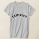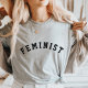Nossa cinza apresenta "FEMINIST" em letras no estilo colegial preto para uma declaração ousada.