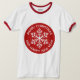 Floco de neve branco com "Feliz Natal e Feliz ano novo" num círculo vermelho festivo.
