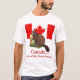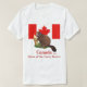 Brincadeira de palavras para esses presentes e roupa. Eles apresentam um castor sentado com a bandeira canadense ao fundo. O texto diz "Canadá.. Casa do Furry Beaver"
