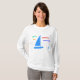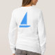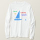 Vá para todas as vendas de garagem na cidade vestindo esta camisa branca. Há dois barcos azuis e a mensagem colorida: "Vamos vai garagem velejar" em verde, ouro, azul e vermelho. Um veleiro azul está atrás.