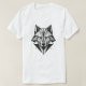 sua majestosa design de camiseta geométrica de raposa, com tons pretos e cinzas profundos, um fundo simples e olhos pretos para um olhar simples e poderoso.