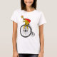 Um desenho engraçado de uma girafa, andando de bicicleta vestida e Papai Noel e carregando um grande saco de presentes de Natal. Se você quiser alguma ajuda para personalizar este design, entre em contato comigo, há um botão para perguntar a este designer, logo abaixo deste texto. A girafa engraçada está andando de bicicleta vintage, penny farthing.