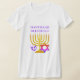 A moderna e personalizável camiseta HANUKKAH, projetada com a falsa menorah dourada, estrela colorida de David e sonho roxo e GREETING PERSONALIZÁVEL, para que você possa criar sua própria saudação. Ideal para a estação de Hanukkah. Escolha entre uma ampla seção de roupas e presentes de Chanucá, desenhados por Designs Bereanos. Também vem em preto.