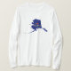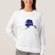 Uma silhueta azul, ou mapa, do estado do Alasca com o slogan "I Heart (Love) Alaska." Venha visitar A Terra Excelente.