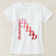 Sobrenome em vermelho corre do lado direito da camisa. À direita estão letras maiúsculas grandes da Primeira inicial do nome, em vários tons de rosa a vermelho profundo. Personalize com seu nome e inicial.