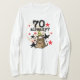 T-shirt cómicos do aniversário do 70, botões do aniversário, cartões, canecas, etiquetas, e outros artigos do roupa e do presente do aniversário do 70 que caracterizam um gato parvo em um chapéu e em um texto do partido que peça "70 já?".
