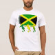 Jogo de três jogadores de futebol na frente da bandeira jamaicana. O nome de país Jamaica está no lado