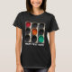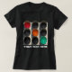 Conjunto de três semáforos com luzes verdes, amarelas e vermelhas acesas. As luzes vão de cima à esquerda para baixo à direita. Só para camisetas divertidas para mulheres. Personalizável. Você pode alterar ou excluir o texto modelo. Para produtos escuros ou negros.