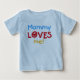 A mamãe ama-me T-shirts, camisetas de manga comprida, fatos-macaco, fatos orgânicos, vestidos sem manga, camisas de rebuliço, chapéus, T-shirts raglan e outros roupas para bebês com texto azul, vermelho e dourado e design cardíaca que lê Mamães me ama!