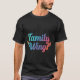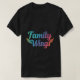 A t-shirt apresenta o texto "Asas Familiares" escrito em múltiplas cores, vibrante, com fundo desfocado.
