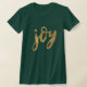 Etapa para fora com ALEGRIA neste divertimento e o t-shirt festivo com uma folha de ouro "ALEGRIA" do falso em uma pia batismal escrita à mão do roteiro. Emparelhe isto com um par confortável de caneleiras de harmonização! Disponível em muitos estilos e cores diferentes da camisa. Design pelo ©TK Goforth. Mais artigos com este design podem ser encontrados em meus ouro do roteiro da alegria e coleção verde do Natal. #holidayz