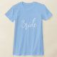 A camiseta feminina é mostrada em um estilo de tripulação e mangas curtas em azul-bebê com texto branco: Noiva. Personalize este item ou comprar como está.