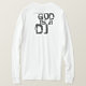 O deus é um DJ. Texto pequeno na parte dianteira e grande na parte traseira. Um t-shirt pesado longo-sleeved realmente legal para aqueles que pense o deus é um DJ. Vestir-lo em seu clube local e obtenha-o o DJ e o dancefloor favorito novo.