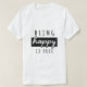 Uma camiseta simples e na moda com a frase **"Being Happy is Free"** impressa em uma fonte limpa e moderna, radiando positividade e alegria.
