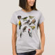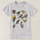 Este T-Shirt inclui uma variedade de espécies de aves - Warbler Prothonotário, Magnolia Warbler, Kinglet com Coroa Rubi, Barão Swallow, Hummingbird com garganta rubi, Pica-Pau Vermelho, Kestrel Americano, Warbler Verde com garganta negra, Warbler com gargalo