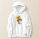 Este hoodie caracteriza um pato amarelo feliz com um boné verde da natação, óculos de proteção e aletas de turquesa, e um floatie vermelho