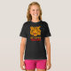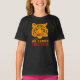 Desenho de um tigre ou face de tigre de cores pretas e laranja. O tigre ou a tigre lamber os lábios. Mande SMS Hoje almoçamos juntos. Camisa de mulher. A tigresa está lá atrás. Você pode alterar ou excluir o texto e a imagem.