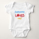 Um design de texto bonito, divertido e colorido em T-shirts, fatos-macaco, T-shirts, chapéus, vestidos sem dormir, camisas e vestidos de roflo, fatos orgânicos, camisas de camisola, capuzes de pulôver, T-shirts escuras e outros roupas que se lê Todo mundo me ama com texto de azul, vermelho e ouro.