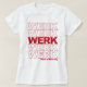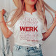 Trendy e engraçada paródia da bolsa de compra clássica "obrigado você, tenha um bom dia" apresenta um lindo design de tipografia retrô com "WERK" em letras ousadas e vermelhas repetidas cinco vezes, e "tenha um bom dia" embaixo.