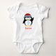 A maravilha de inverno "ONEderland", primeira camisa de festa de aniversário, apresenta um pinguim ártico bonito vestindo um chapéu de Papai Noel com um número "1" / um na barriga. Cor azul-gelo, turquesa, vermelha, preta e branca. Personalize com o nome do seu filho.