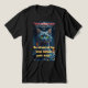 O design é feito em um estilo escuro e místico com elementos de horror. No centro da imagem está um gato-cinza expressivo com olhos amarelos, sentado entre carvões com línguas de chamas. O fundo é decorado com elementos de madeira esculpidos, criando a atmosfera de um castelo antigo. O texto é desenhado em cores contrastantes: a parte superior é em tons vermelhos e cinzas, e a parte inferior é em amarelo, enfatizando o significado sinistro da frase. A composição geral cria um sentimento de mistério e tensão.