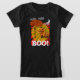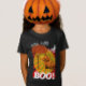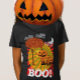 Fácil camisa de Halloween ou Festa de Colheita Figurino para o bebê. Excelente para a festa da igreja! Família de Abóbora Bonita de pé por uma árvore com Folhas de Outono Laranja em uma camiseta. Lua branca e nuvens com uma família de Cabeça de Abóbora de Halloween, sorridente, com um BOO Amigo! Com Olhos Engraçados em Cima de Cada Letra Grande! Somadas as faixas gráficas vermelhas e amarelas em segundo plano. Parece um Design de Sinalizador solar japonês