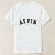 Alvin! É seu nome Alvin? Ou você tem um marido, um namorado, um membro da família masculino ou um homem Alvin nomeado amigo? Em caso afirmativo, esta camisa da "bandeira" é exatamente o presente que você está procurando! As características de design "Alvin" na rotulação preta arqueada através da caixa na pia batismal clássica da faculdade.