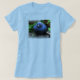 Um pássaro azul de vista grouchy no tshirt azul das mulheres. Subtítulo: Eu olho como o bluebird da felicidade?