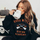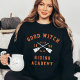 Mostre algum espírito escolar neste Halloween! Design das bruxas bonitas de Halloween para bruxas em treinamento mostra "Good Witch Riding Academy, 1692, Salem, Massachusetts" em letras colégios cor de laranja, com duas ilustrações cruzadas de vassouras.