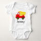 Um belo macacão de cartoon para um menino. Ilustração de desenho animado do veículo de construção. Personalizado com o nome da criança. Ideia divertida de presente para festa de chá de fraldas.