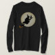 A silhueta da bruxa em um broomstick com o fogo que sai da vassoura e de um gato preto empoleirou-se no punho contra uma Lua cheia redonda.