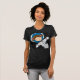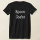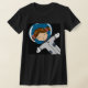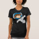 Uma menina que flutua no espaço com um olhar do spacy em sua cara. O cadete do espaço é soletrado em letras da tira na parte traseira.