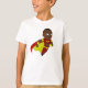 Camiseta infantil com ilustração de um sorridente super-herói afro-americano vestindo roupa e capa vermelha e amarela