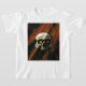 Caveira mau com tomadas oculares brilhantes e um fundo escuro com padrões de fundo com listras de laranja, marrom e preto. Feliz Dia das Bruxas, mortais.