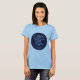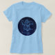 Tee apresentando o símbolo do zodíaco de Virgo em azul-prata-mole, como medalhão-redondo, sobreposto às estrelas da constelação, contra um fundo do céu estrelado formando de azul-da-meia-noite a preto.