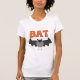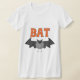 Um morcego preto do Halloween e um texto laranja que diz "BAT" em t-shirts de morcegos, fatos, canecas, cartões, autocolantes, sacos de tote, botões, ímãs e outras t-shirts e presentes MTD do Halloween.