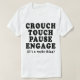 Crouch, Touch, Pause, Engage! É uma coisa de râguebi, onde o árbitro chama cada elemento do início de um arranhão. É também uma frase bonito e interessante! Também disponível em camisetas escuras, assim como sem o comentário qualificado na parte inferior. Em outras palavras, se você ousar, pegue aquele que não diz "é uma coisa de rúgbi"! Procure-o na seção SPORTS do nosso compro em camisetas verdes!