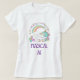 Uma camiseta com uma design engraçada e engraçada. Um milho branco com mana e cauda de cor pastel e 3 estrelas pequenas nas costas dela. Um arco-íris colorido. Cercado por uma coroa circular composta por nuvens, corações e flores para um talho feminino adicional. O texto diz Magical AF. Humor e adorável.