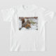 Foto de um esquilo bonito na neve com um amendoim em sua boca.