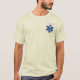D. Na frente da camisa está "EMT" sobre uma estrela azul e atrás está o mesmo símbolo de resgate EMS em tamanho maior.