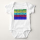 Um macacão de camisa com o alfabeto inglês em letras coloridas.