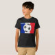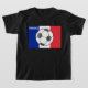 A bandeira nacional da França, a bandeira tricolor com três bandas verticais coloridas azul, branca e vermelha, forma o pano de fundo de um jogo de futebol (bola de futebol).