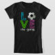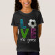 T-shirt desportivo do futebol com a frase "AMOR o jogo." O "o" é substituído por uma bola de futebol.