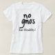 Expresse a sua opinião sobre as comidas geneticamente modificadas e os riscos para a saúde associados a estas comidas. Esta camiseta mostrará como você se sente com as palavras "no gmo's" e as palavras personalizáveis "Coma saudável" em negrito texto preto sobre fundo branco. As comidas de OGM são proibidas na União Europeia, mas são vendidas nos EUA sem rotulagem. Mostre as suas preocupações ao dizer "não há OGM" para promover comidas saudáveis e o ambiente. Alguns estados estão começando a exigir etiquetas, mas a maioria não está nesse ponto.